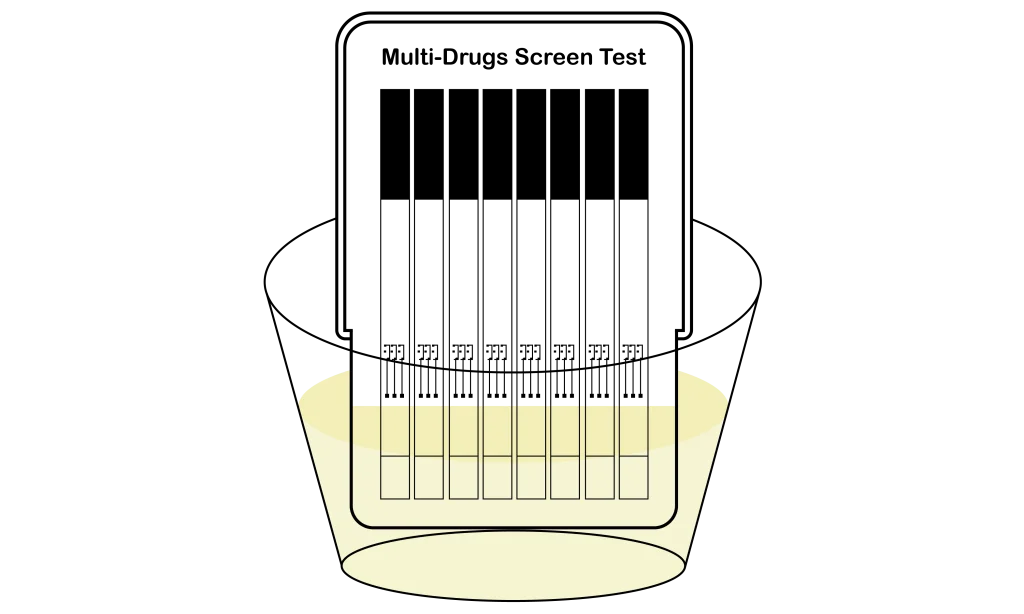 4.2 Si el volumen de la muestra de orina es inferior a la ventana de muestreo, sumerja el panel en la muestra de orina durante al menos 20 segundos. Vuelva a colocar la tapa y coloque el panel de prueba sobre una superficie plana.